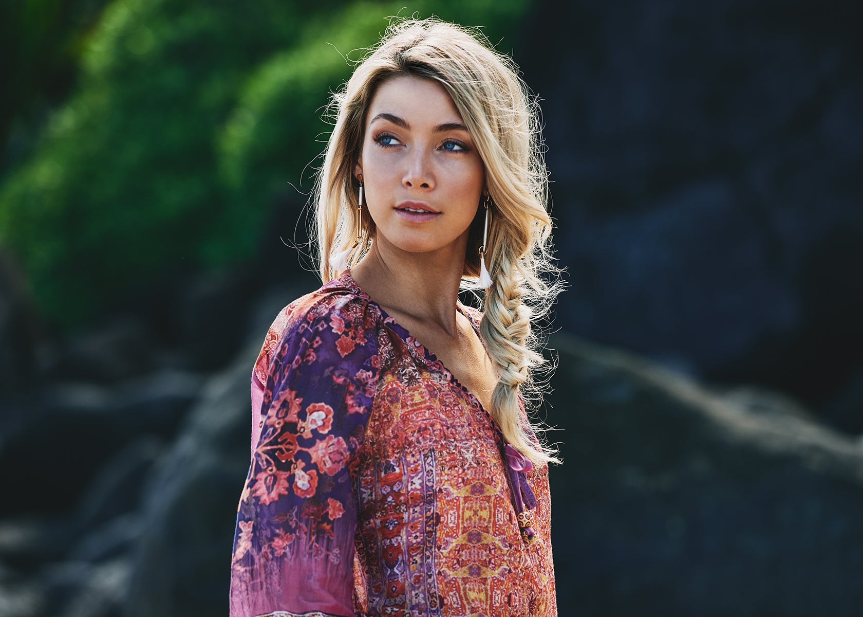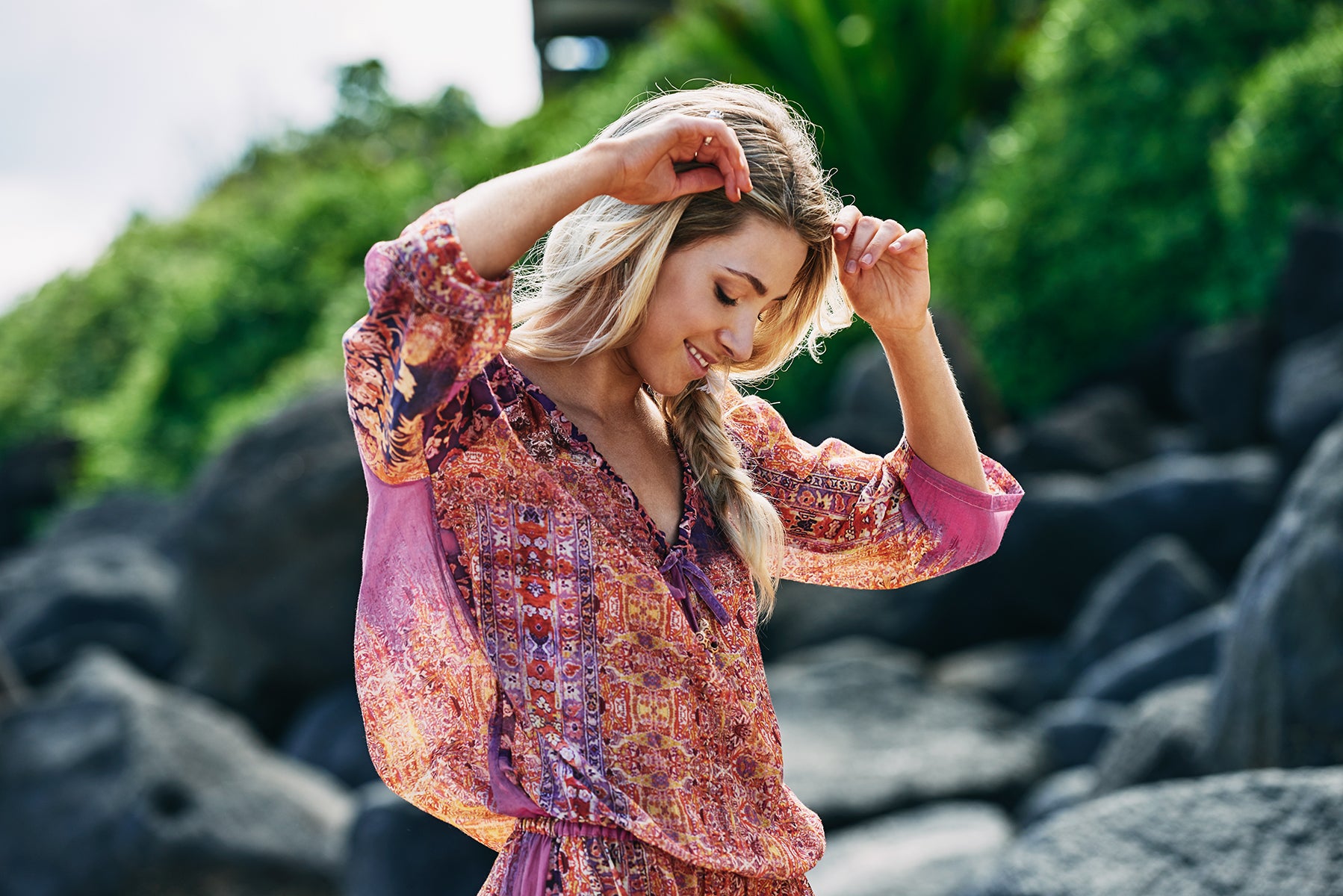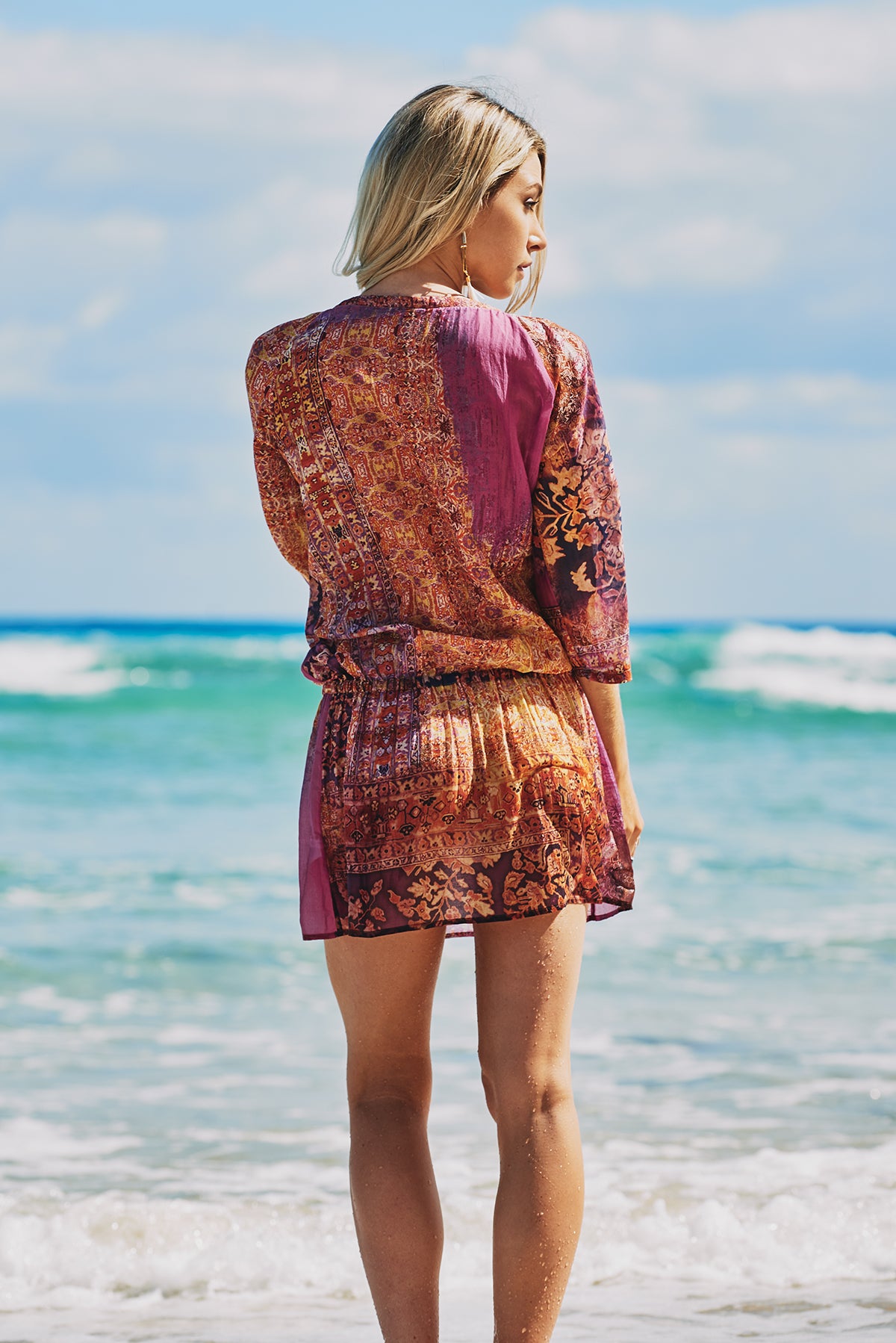 Lightweight silk & cotton 3/4 sleeve Bohemian mini dress in pink mosaic print with an elastic waistband. Drawstring at the neckline with wooden beads. Dry-clean highly recommended.